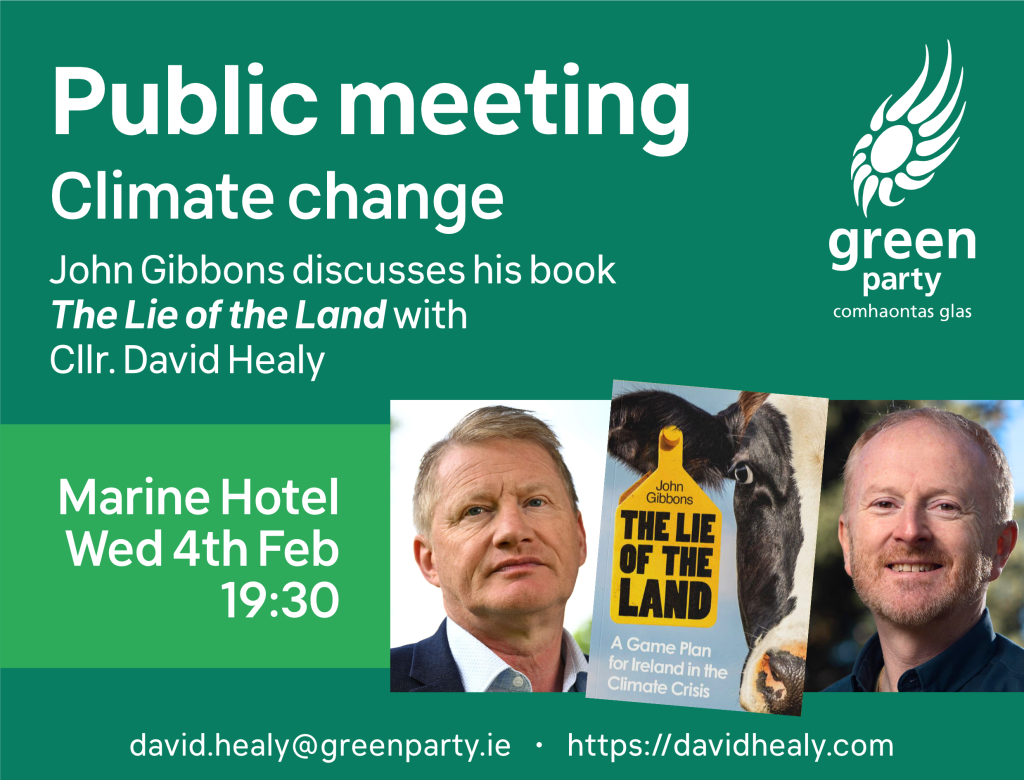 John Gibbons, author of The Lie of the Land: A Game Plan for Ireland in the Climate Crisis, will speak at a public meeting in the Marine Hotel, Sutton at 7.30pm on Wednesday 4th February.